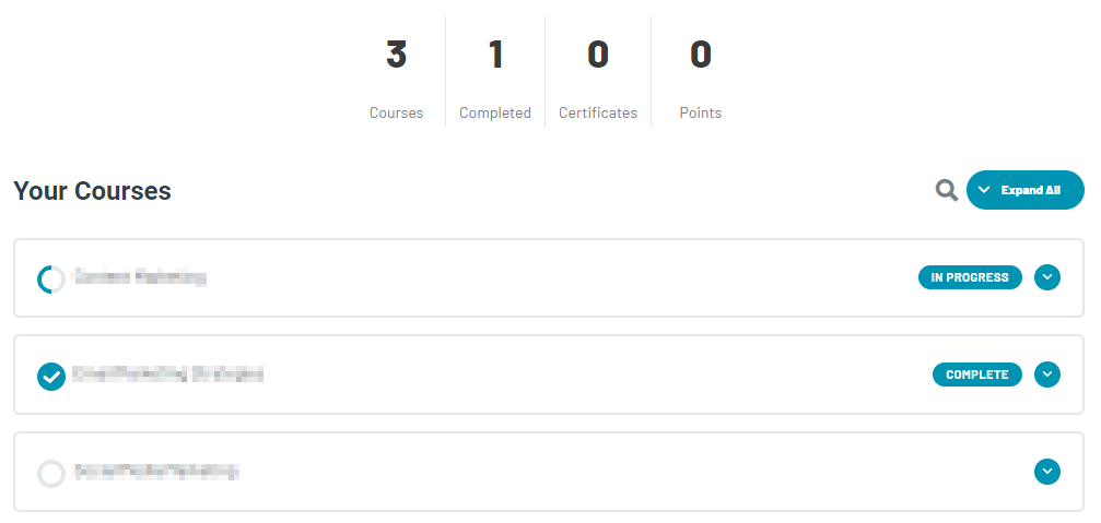 At the top of the screen, you will see the number of courses assigned to you, the number of courses you have completed and the number of certificates you have received. Note that not all courses lead to a certificate.
