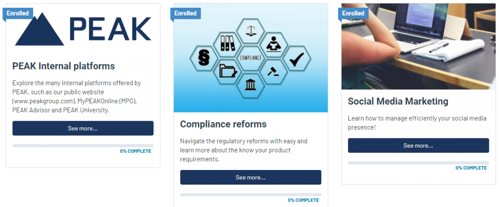 Go back to the PEAK University home page anytime by clicking the PEAK logo in the top left corner. Any uncompleted training stays as is and can be completed later.